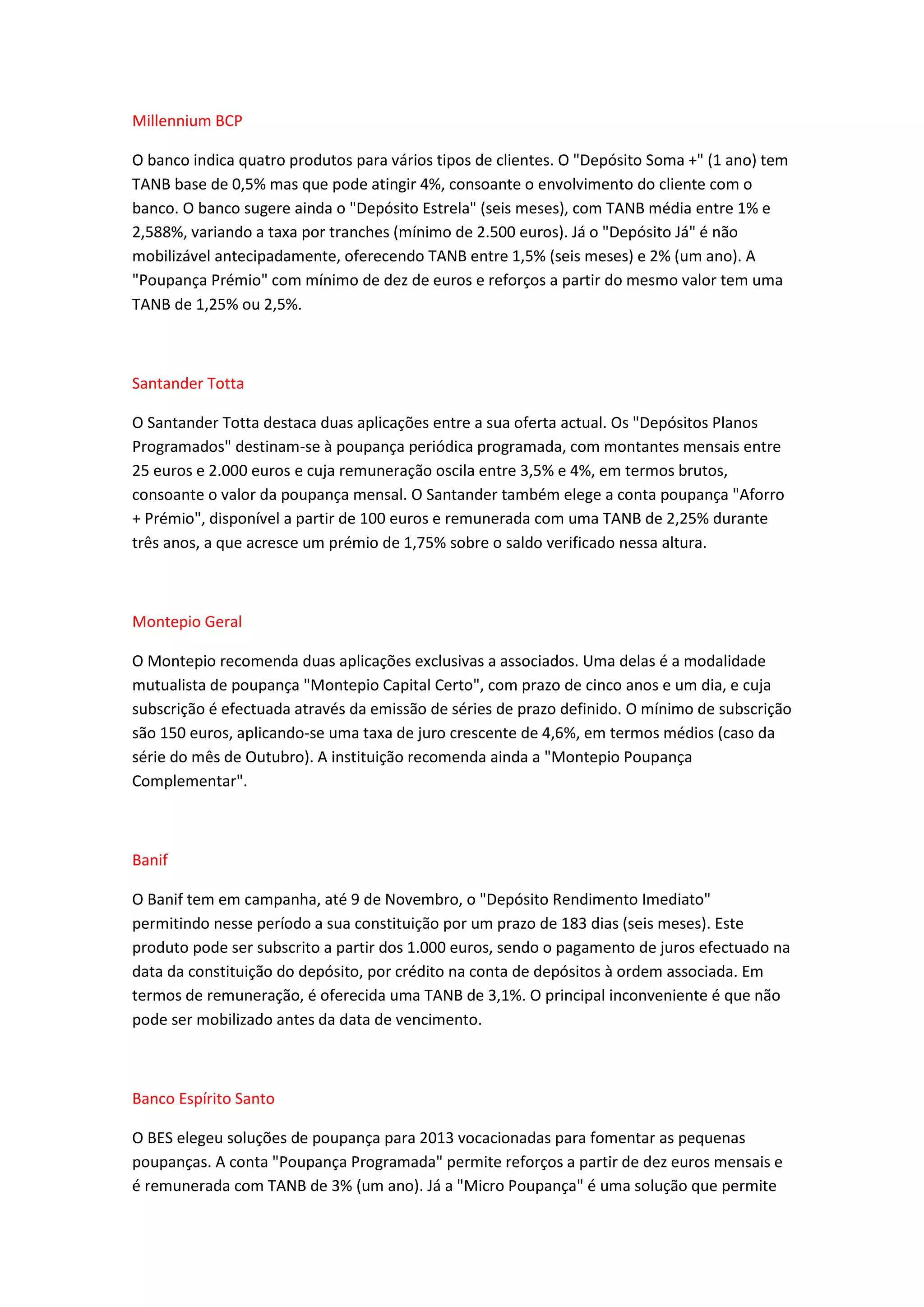 O documento descreve produtos de poupança e depósitos de vários bancos portugueses, incluindo taxas de juro, prazos e requisitos mínimos. Os bancos oferecem uma variedade de contas poupança e depósitos a prazo para atrair clientes com diferentes perfis de risco e objetivos financeiros.