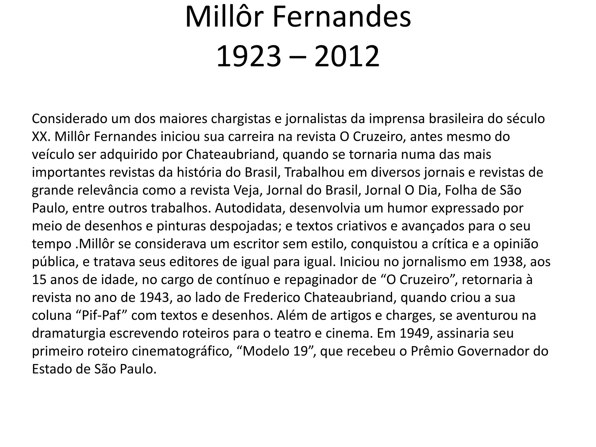Millôr Fernandes foi um dos maiores chargistas e jornalistas brasileiros do século XX, trabalhando em publicações como O Cruzeiro e Veja. Ele iniciou sua carreira em 1938 no jornal O Cruzeiro e se tornou conhecido por seu humor expresso em desenhos e textos criativos. Além de charges, Millôr também escreveu roteiros para teatro e cinema.