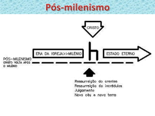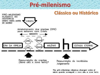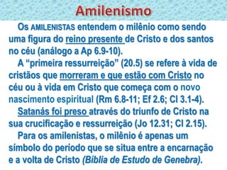 O milênio, descrito em Apocalipse 20.1-10, é interpretado de diversas formas, sendo a visão amilenista a mais destacada, onde representa o reino presente de Cristo e a coexistência do bem e do mal até sua segunda vinda. Os pré-milenistas acreditam que o milênio ocorre após a segunda vinda de Cristo, trazendo um período de paz, enquanto haverá uma ressurreição geral e um juízo final. Ambas as visões enfatizam o crescimento do evangelho e a expectativa de um novo céu e nova terra após o juízo.