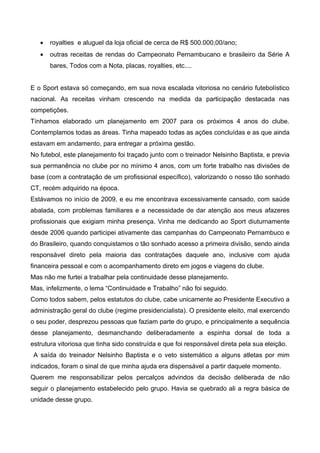 Milton Caldas Bivar escreve uma carta aberta à torcida do Sport defendendo sua gestão no clube e rebate acusações de que seria um ditador. Ele detalha as conquistas e melhorias financeiras e estruturais implementadas sob sua liderança, mas reconhece estar cansado e precisar se afastar, embora tenha elaborado um plano de continuidade que não foi seguido pela nova gestão.