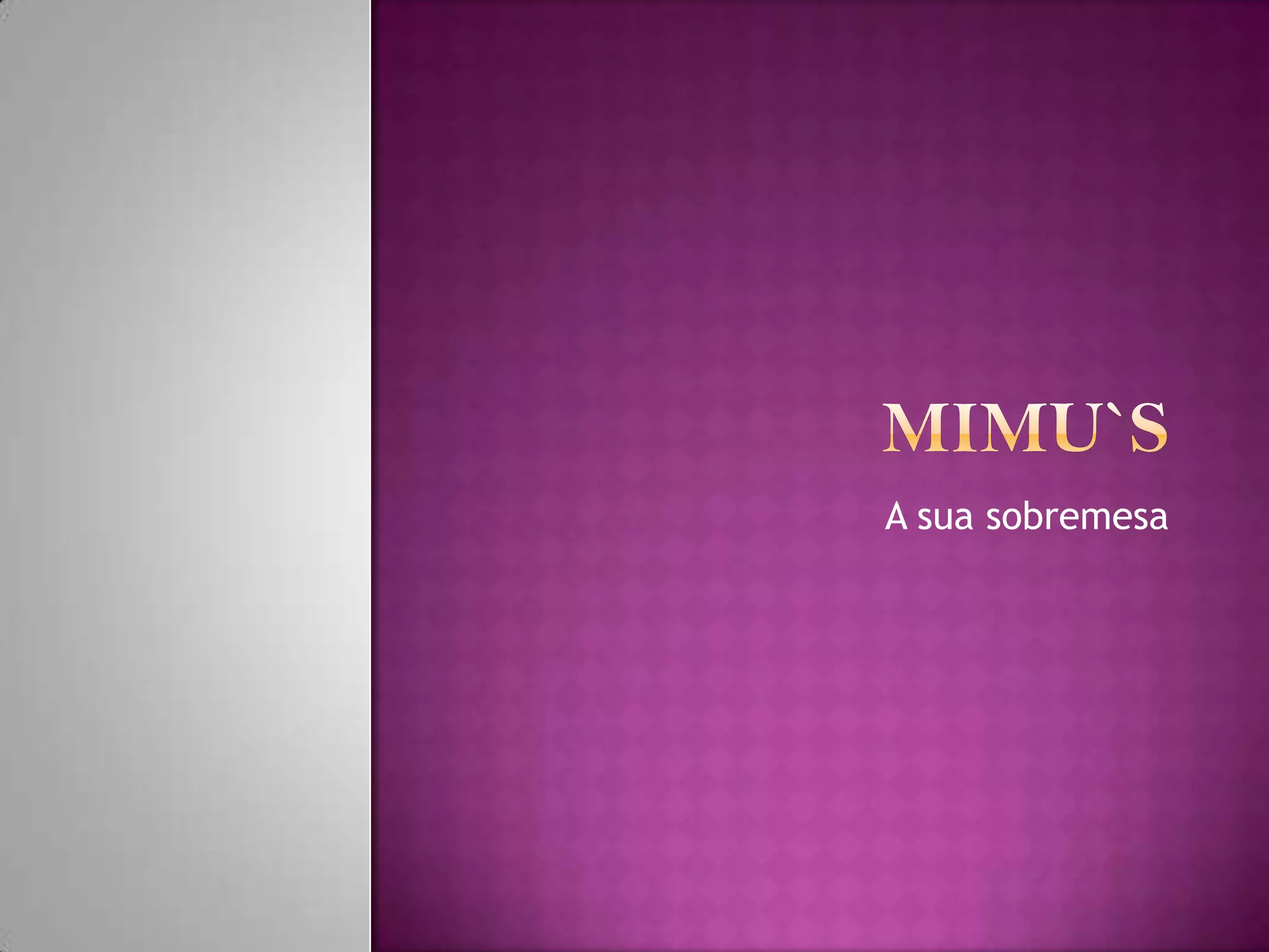 A Mimu's é uma empresa de 14 anos que fornece sobremesas para restaurantes e organiza festas como aniversários, casamentos e batizados. Oferece bolos personalizados com vários sabores e recheios a partir de 18€/kg, além de outros doces e salgados como cheesecake, lasanha de maçã e salgadinhos.