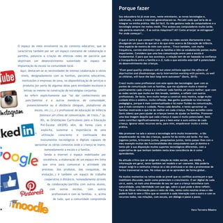 O documento discute a importância da escola integrar criticamente as tecnologias digitais no processo de ensino e aprendizagem para desenvolver usuários conscientes. A escola deve usar estratégias tecnológicas de forma a aproximar a escola e a família e estender a aprendizagem para além da sala de aula. No entanto, também é importante ensinar os estudantes a serem cautelosos com sua identidade digital e proteger suas informações pessoais online.