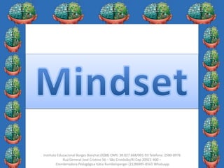 O documento discute a importância do mindset na formação e mudança de crenças humanas, apresentando o Instituto Educacional Borges Boechat e propondo reflexões sobre como os 'adversários internos' afetam a percepção de realidade e decisões pessoais. Cita a construção de modelos mentais a partir de biologia, linguagem, cultura e experiências pessoais, enfatizando que a mudança no mindset pode levar a mudanças comportamentais significativas. O texto também menciona intervenções para cultivar uma mentalidade de crescimento, sugerindo que o conhecimento e a disposição para aprender são fundamentais para superar crenças limitantes e alcançar realizações.