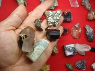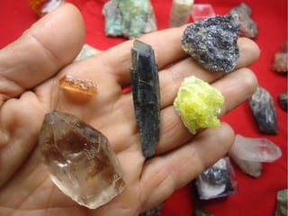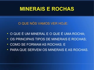 O documento discute minerais e rochas, definindo-os e explicando seu uso e formação. Aborda os principais tipos de minerais e rochas, incluindo silicatos, não-silicatos, ígneas, metamórficas e sedimentares. Também explica como as rochas se formam através do ciclo das rochas e dá exemplos do uso de minerais e rochas na construção e outros fins.