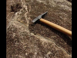 O documento discute os principais tipos de rochas e minerais, incluindo sua formação e classificação. Aborda rochas ígneas, sedimentares e metamórficas, além dos processos de intemperismo, transporte, deposição e litificação que levam à formação de rochas sedimentares.