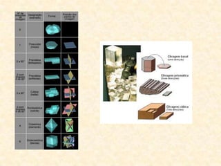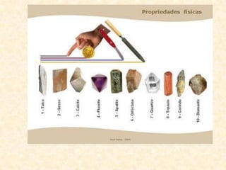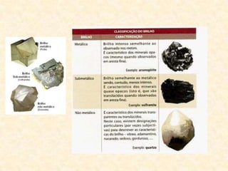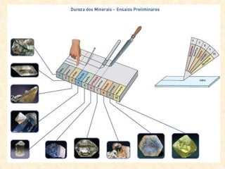 Rochas são agregados naturais de um ou mais minerais. Minerais são substâncias inorgânicas com composição química e estrutura cristalina definidas. As propriedades físicas, químicas e óticas dos minerais como cor, risca, brilho, dureza e clivagem permitem sua caracterização e identificação.