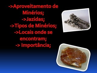 [1] O documento discute a importância dos minérios e da mineração para a sociedade, destacando que minérios são encontrados em muitos itens do dia a dia como tijolos e caixas d'água, e que uma pessoa consome direta ou indiretamente 10 toneladas de produtos do reino mineral. [2] Apresenta os principais tipos de minérios no Brasil, como ferro, manganês e alumínio, e explica que jazidas são concentrações de minérios que podem ser exploradas. [3] Con