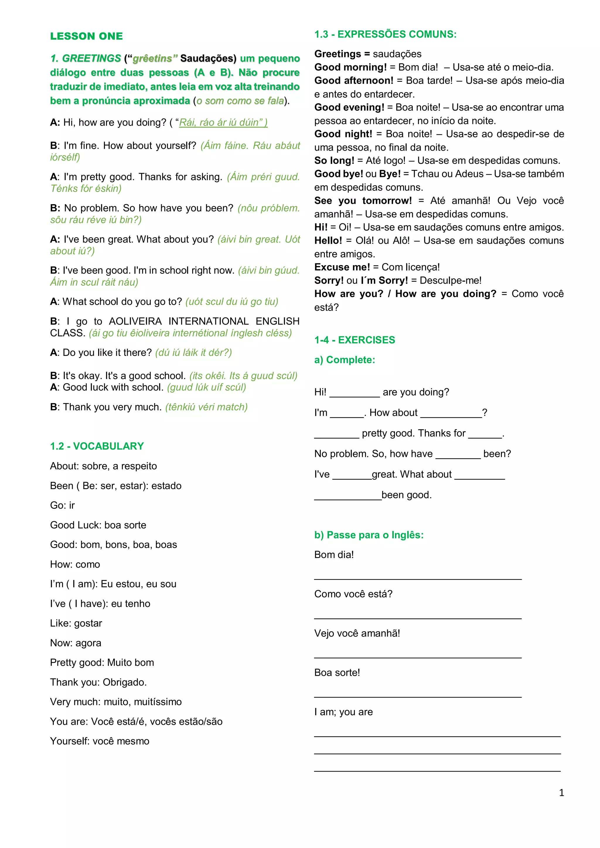 1. O documento apresenta um diálogo em inglês entre duas pessoas sobre saudações e como estão.