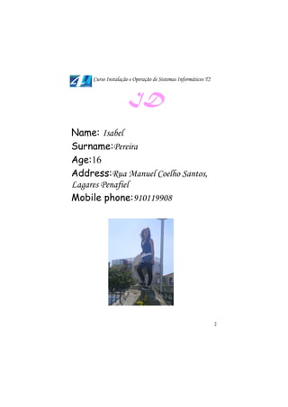 O documento lista informações pessoais de dois estudantes (Isabel Pereira e Fábio Alves) e fornece uma lista de palavras em inglês relacionadas a computadores e tecnologia, além de imagens ilustrando diferentes componentes de hardware como baterias, cabos, computadores, câmeras digitais e impressoras.