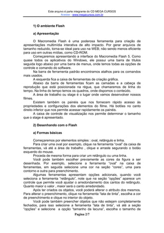 Este documento fornece uma introdução ao software Macromedia Flash, descrevendo suas ferramentas e funcionalidades básicas para criação de animações e apresentações multimídia, incluindo formas, gradientes, escala e rotação de objetos. Também explica conceitos como símbolos, camadas, agrupamento e desagrupamento de objetos.