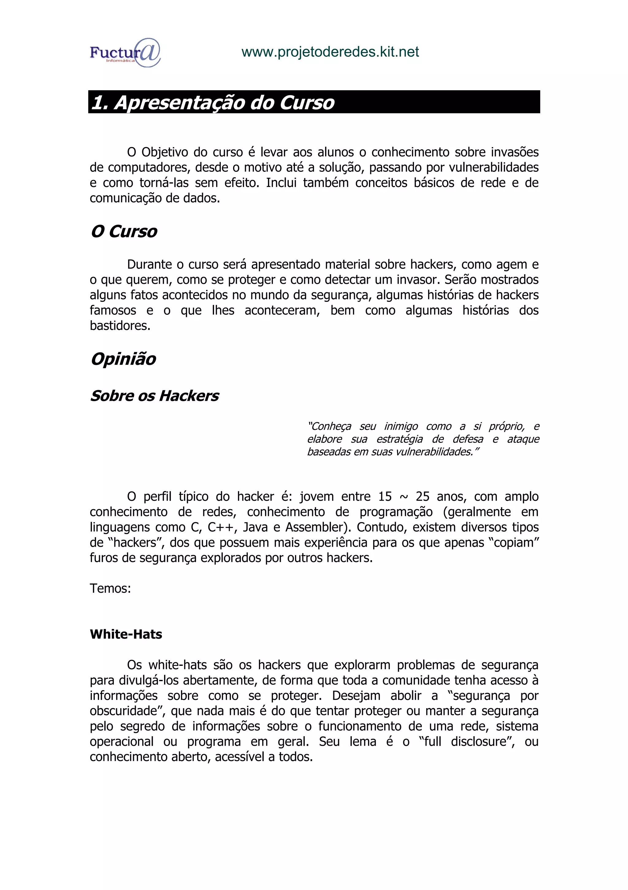 O documento discute conceitos de segurança em redes de computadores, incluindo tipos de hackers (white hats, black hats, crackers, phreakers e wannabes) e um estudo de caso sobre o hacker Kevin Mitnick e seu confronto com o especialista em segurança Tsutomu Shimomura. O documento também fornece uma introdução sobre redes e protocolos como TCP/IP, ARP e IP.