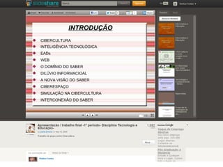 O documento discute o uso de webquests como uma metodologia de ensino que utiliza recursos da internet para promover a aprendizagem. Ele explica o que é uma webquest, suas seções e fases de desenvolvimento, além de sugerir atividades e objetivos educacionais como desenvolver habilidades e favorecer a inclusão digital.