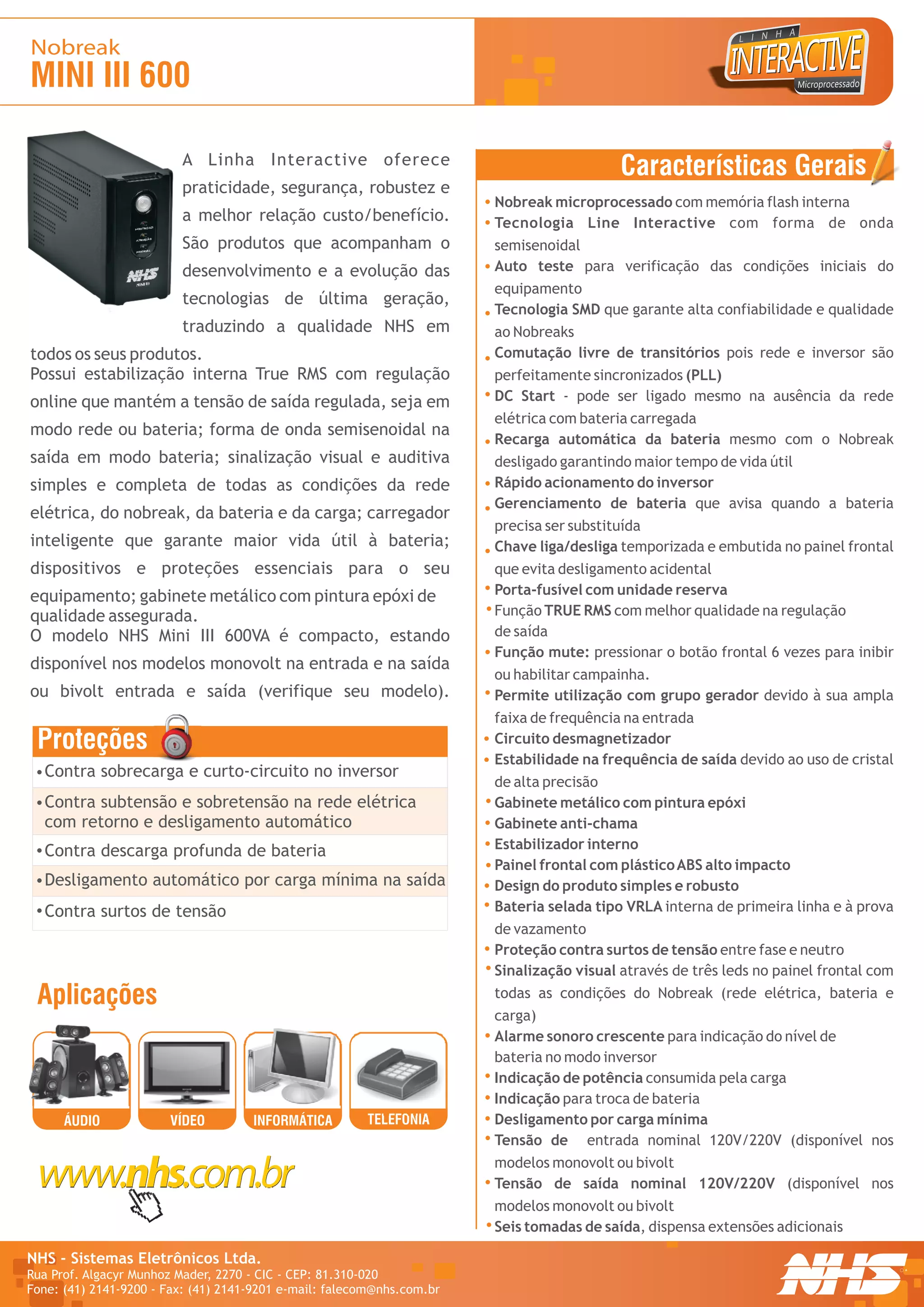 O documento descreve um nobreak da marca NHS modelo Mini III 600. Ele fornece proteção contra interrupções no fornecimento de energia elétrica e possui autonomia de 5 minutos a carga completa ou 12 minutos a meia carga. O nobreak possui especificações técnicas detalhadas incluindo tensão e frequência de entrada e saída, potência, tipo e capacidade da bateria, proteções, dimensões e aplicações.