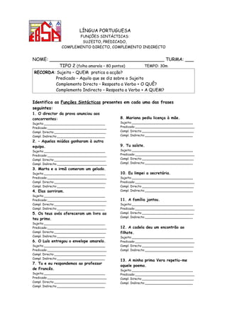 Este documento apresenta 13 frases para identificar as funções sintáticas de sujeito, predicado, complemento direto e complemento indireto. O aluno deve preencher as funções para cada frase.
