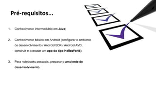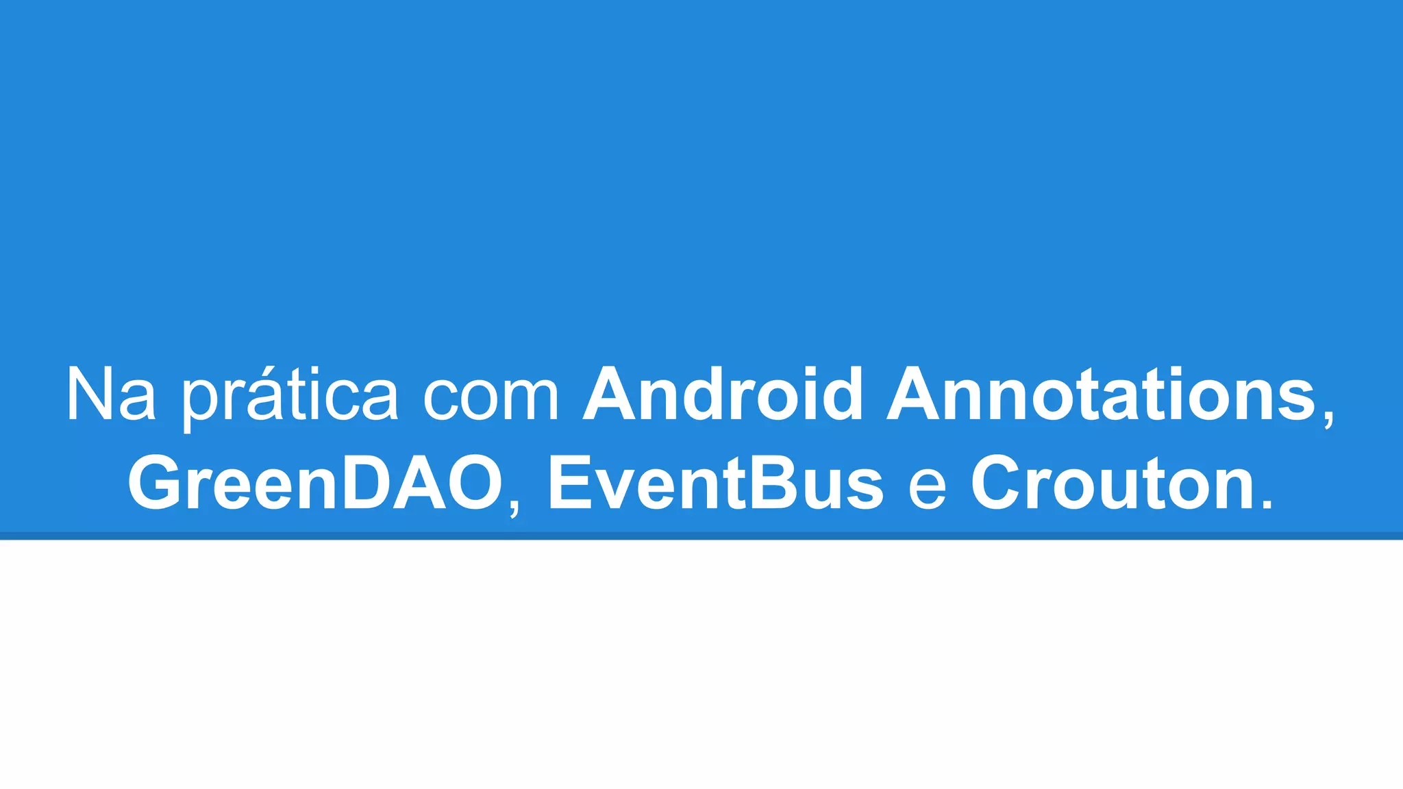 O documento discute o uso de bibliotecas populares para Android como GreenDAO, EventBus, Crouton e Android Annotations. Ele fornece uma introdução a cada biblioteca, incluindo seus principais recursos e empresas que as usam, como Facebook e Pinterest. O documento também mostra exemplos de código para ilustrar o uso dessas bibliotecas.