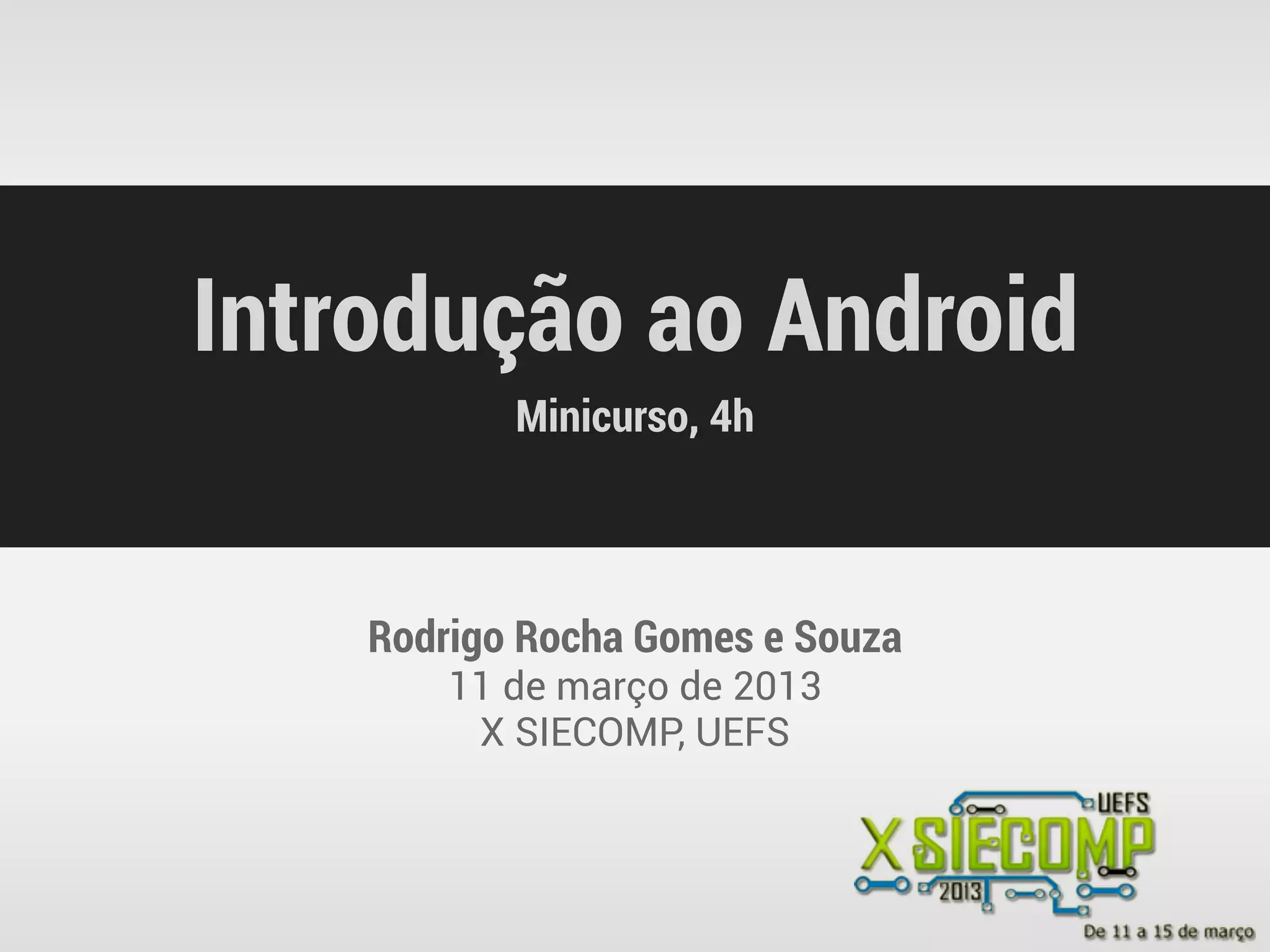 Este documento fornece um resumo de um minicurso de 4 horas sobre introdução ao Android. O minicurso apresenta o ambiente de desenvolvimento Android, ensina como criar um "Olá Mundo" e explica conceitos como estrutura de aplicativos, ciclo de vida de atividades, múltiplas telas, preferências, ListView e Intents. O minicurso ensina esses conceitos através da criação de pequenos aplicativos de exemplo para cada tópico.