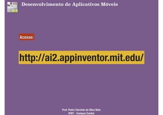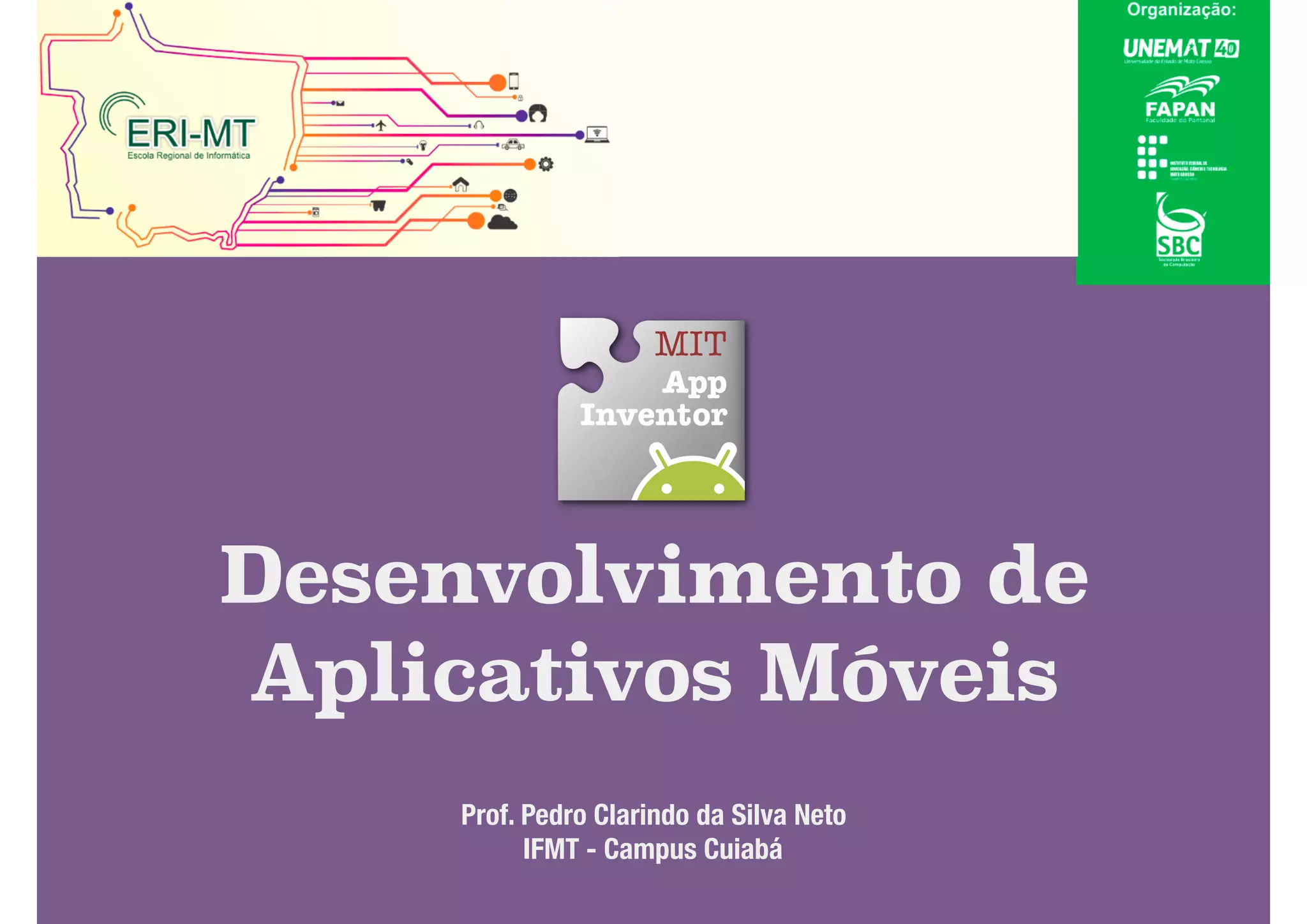 O documento aborda o desenvolvimento de aplicativos móveis sob a orientação do professor Pedro Clarindo da Silva Neto no IFMT - Campus Cuiabá. Inclui projetos práticos, como um aplicativo chamado 'Miau!' e uma calculadora, além de um desafio relacionado ao funcionamento de botões e um jogo chamado 'Bambam'. O professor também fornece informações de contato e recursos adicionais.