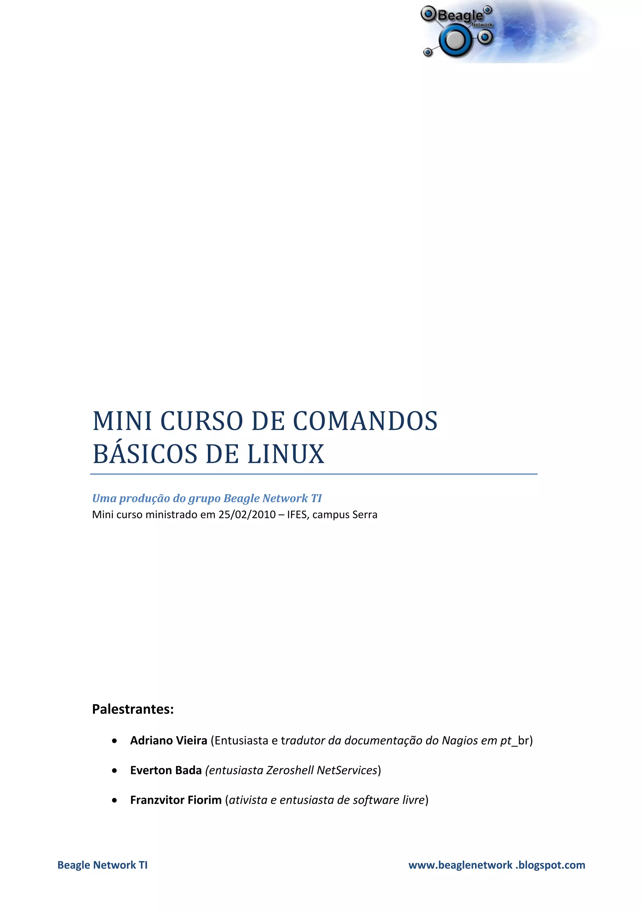 O documento apresenta um mini curso sobre comandos básicos do Linux, incluindo: 1) a estrutura de diretórios do Linux, 2) comandos para navegar e manipular arquivos e diretórios como cd, mkdir, rmdir, touch, rm, cp, mv, 3) como escrever mensagens com echo e ler arquivos com cat.