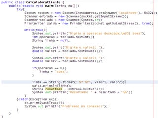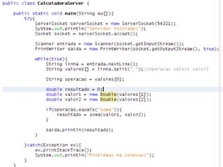 O documento discute sockets em Java, abordando tópicos como: