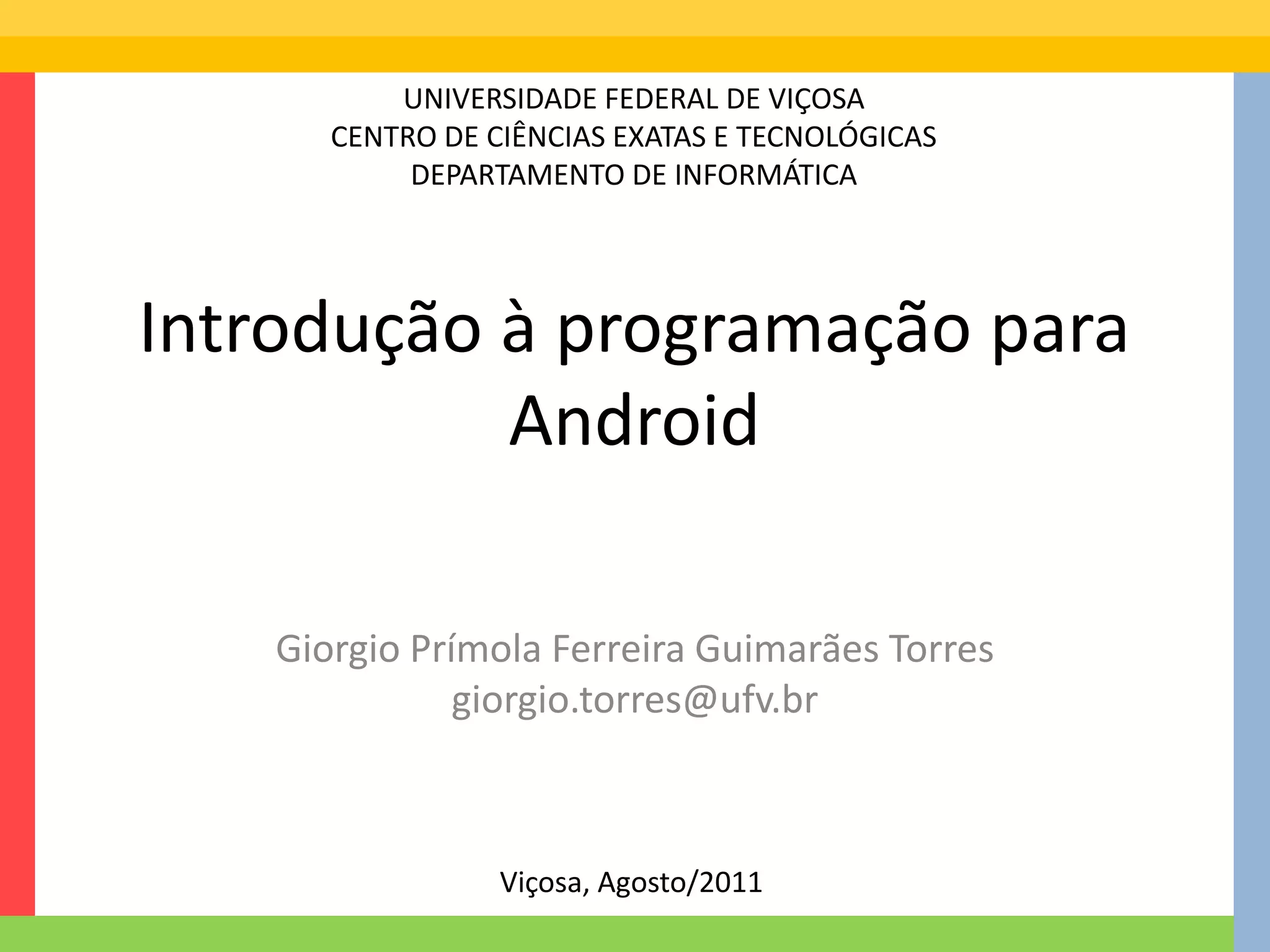 O documento introduz o desenvolvimento para Android, discutindo porque programar para a plataforma, seu crescimento, arquitetura e como começar com um projeto simples "Hello World". É apresentado o ambiente de desenvolvimento e componentes como Activity e Service.