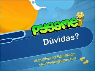 Este documento fornece uma introdução ao Pygame, uma biblioteca gráfica para Python que permite a criação de jogos. Ele explica como funcionam os principais componentes de um jogo no Pygame, incluindo eventos de mouse e teclado, módulos para imagens, sons, sprites e tempo.