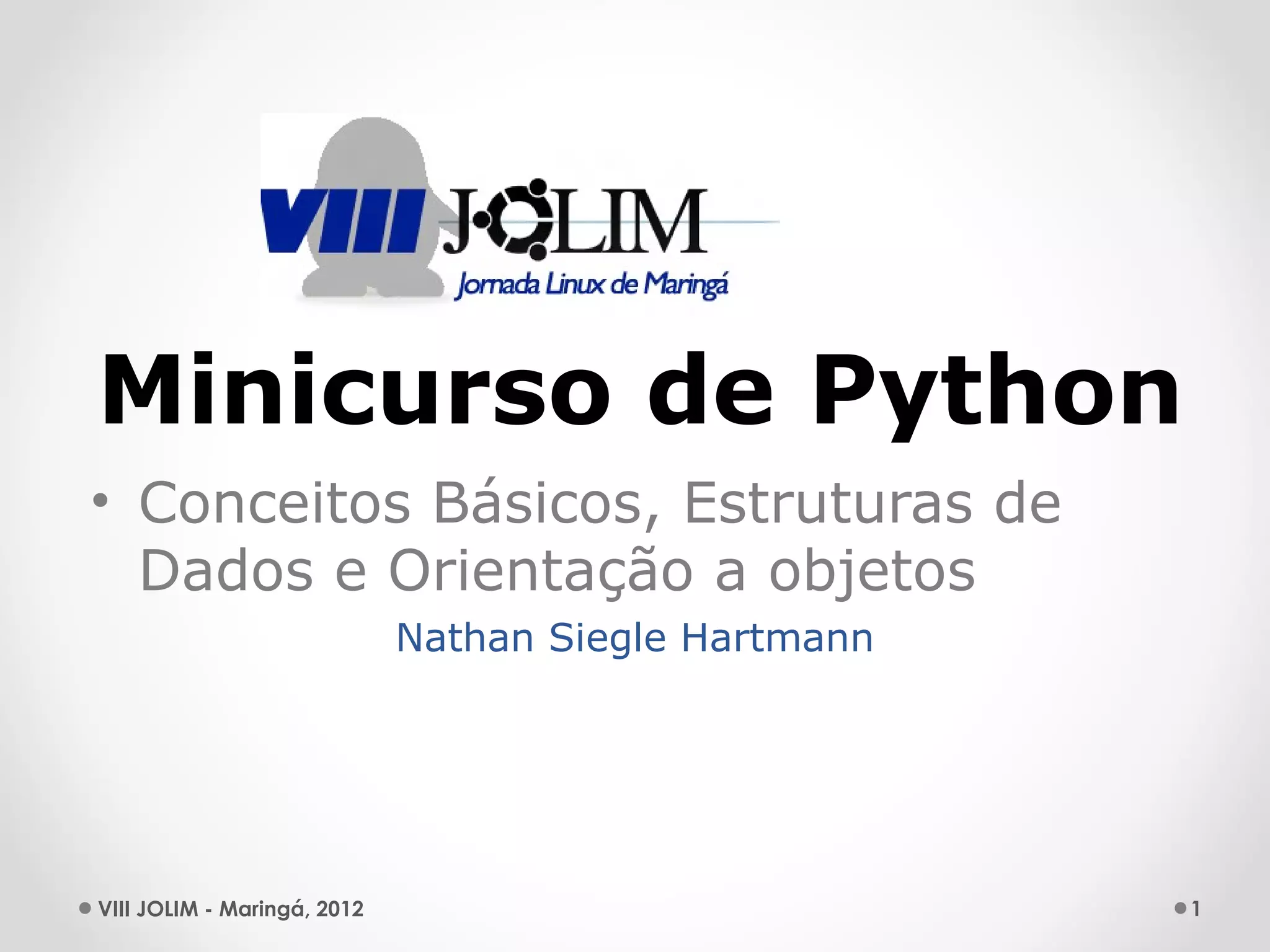 Este documento apresenta um minicurso sobre Python, abordando conceitos básicos, estruturas de dados e orientação a objetos. As principais seções incluem uma introdução à linguagem Python, exemplos de sintaxe, variáveis, operadores, funções, strings, arquivos, listas, dicionários e recursão.