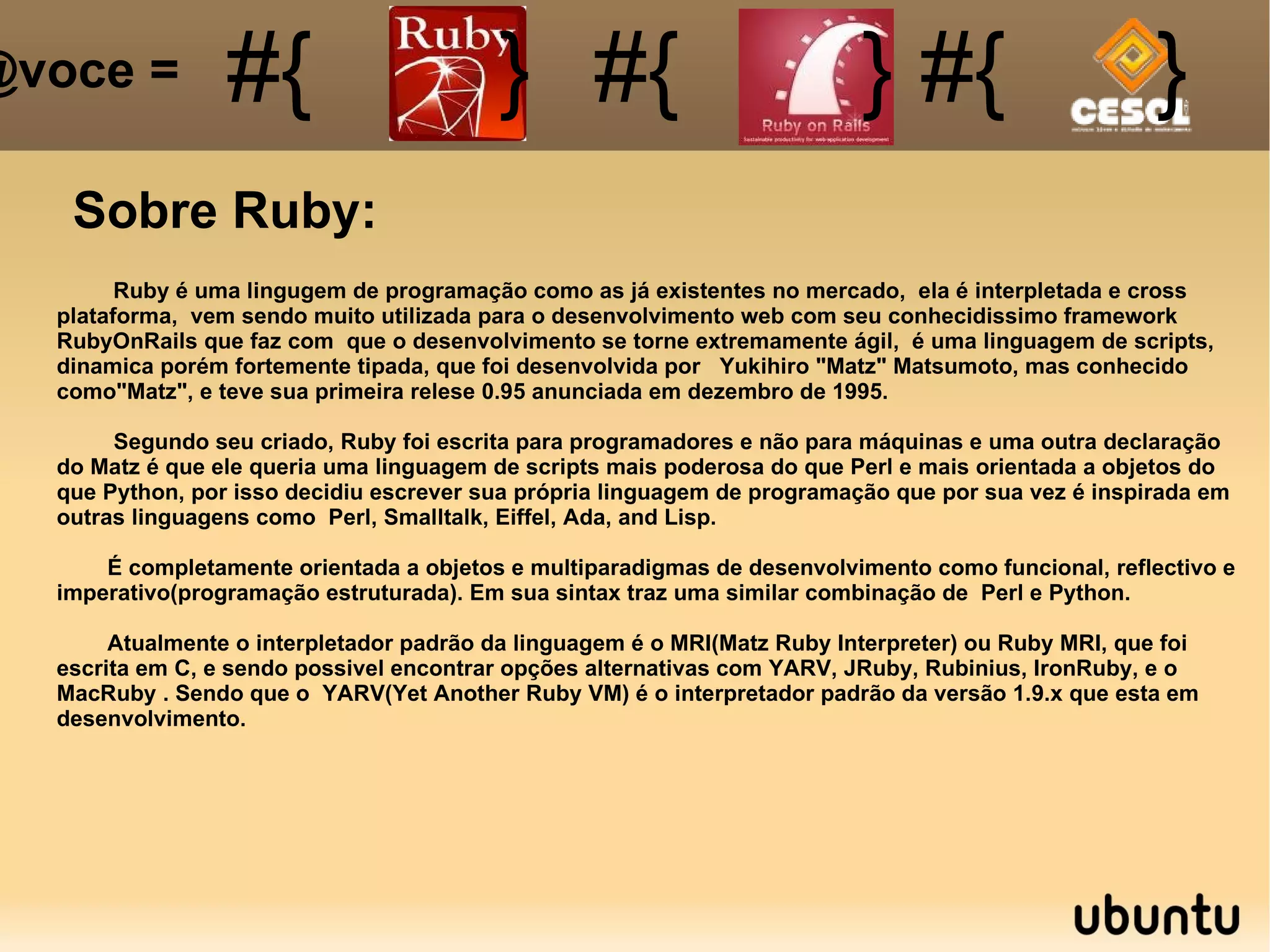 O documento aborda a linguagem de programação Ruby e seu framework Ruby on Rails, destacando suas características, como ser interpretada e orientada a objetos. Introduz conceitos como 'convenção sobre configuração' e 'não se repita', e fornece um guia prático para instalação, criação de aplicações e estruturas de projeto. Além disso, descreve a criação de um CRUD e implementação de validações, utilizando exemplos práticos de código.