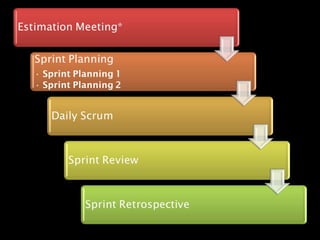 O documento descreve o framework Scrum para gestão ágil de projetos. Scrum é baseado em sprints curtos com reuniões diárias para acompanhamento do progresso e identificação de impedimentos. Ao final de cada sprint, as funcionalidades desenvolvidas são apresentadas para validação e priorização de novas funcionalidades pelo Product Owner. Scrum promove a auto-organização das equipes e foco na entrega contínua de valor ao cliente.