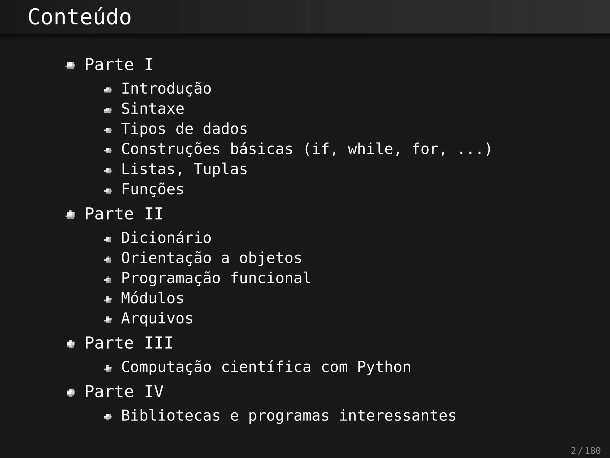 Este documento apresenta uma introdução à programação com a linguagem Python. Ele está dividido em quatro partes principais: (1) introdução à sintaxe e tipos de dados básicos em Python, (2) estruturas de dados adicionais como dicionários e orientação a objetos, (3) programação funcional e módulos, e (4) bibliotecas e aplicações interessantes. A primeira parte cobre tópicos como listas, tuplas, funções e construções condicionais e iterativas.