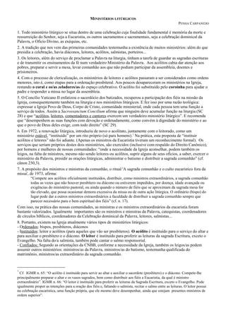 O documento discute os vários tipos de ministérios litúrgicos na Igreja, incluindo ministérios ordenados, instituídos e confiados. Também descreve os papéis de presidência, comentarista, acolhimento, música, leitura e distribuição da comunhão.