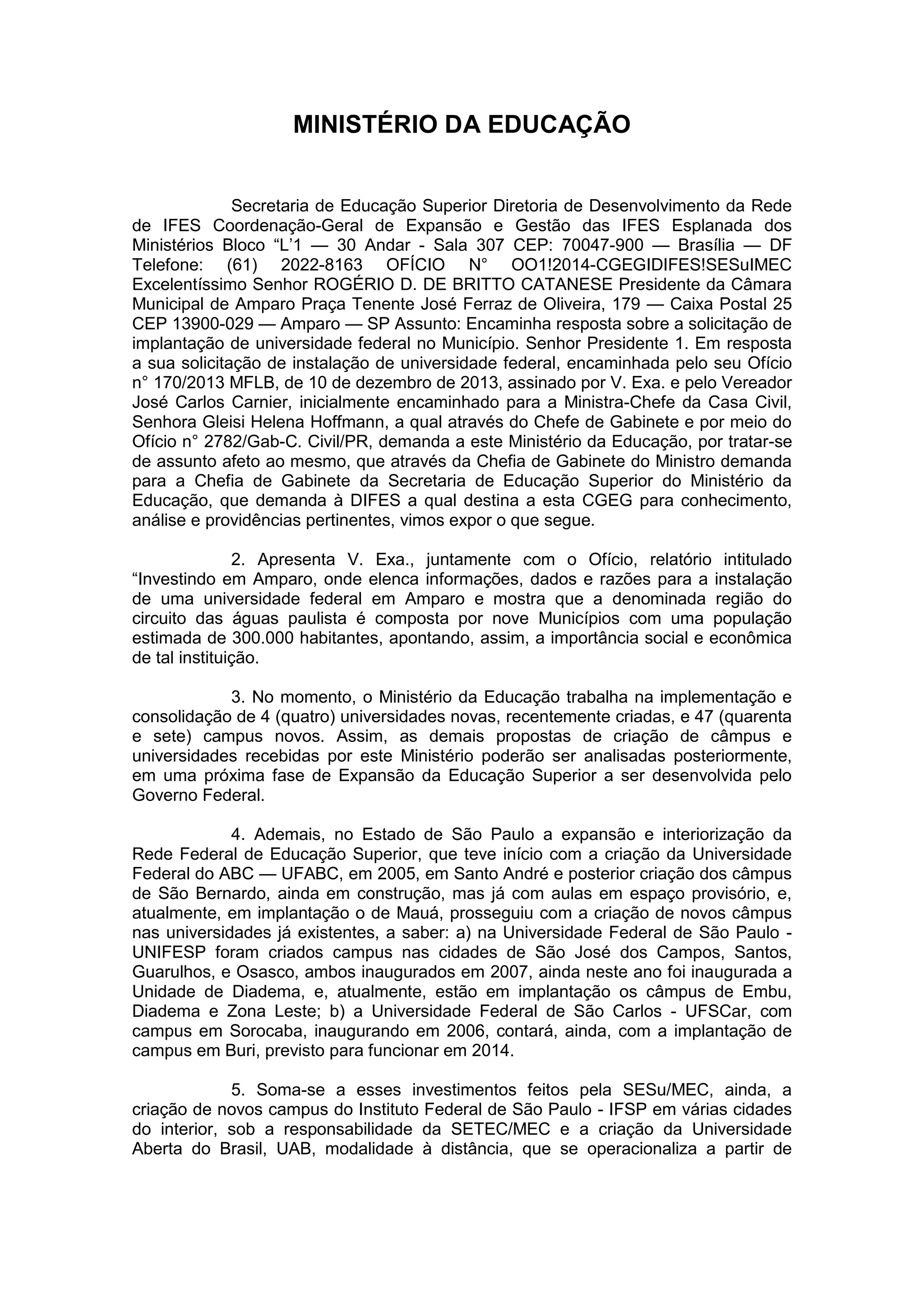 O Ministério da Educação responde à solicitação de implantação de uma universidade federal em Amparo, São Paulo. No momento, o MEC está focado em implementar 4 novas universidades e 47 novos campi, mas promete analisar futuramente outras propostas como a de Amparo. O MEC também destaca os investimentos recentes em educação superior no estado de São Paulo, como novos campi em universidades existentes e no Instituto Federal de São Paulo.