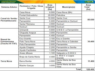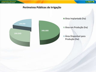 O documento discute a política nacional de irrigação e produção de biocombustíveis no semi-árido brasileiro. Ele fornece detalhes sobre a estrutura do Ministério da Integração Nacional, áreas irrigadas no Brasil, culturas irrigadas, perímetros públicos de irrigação e as vantagens comparativas da produção de cana-de-açúcar no semi-árido nordestino em relação ao Centro-Oeste do país.