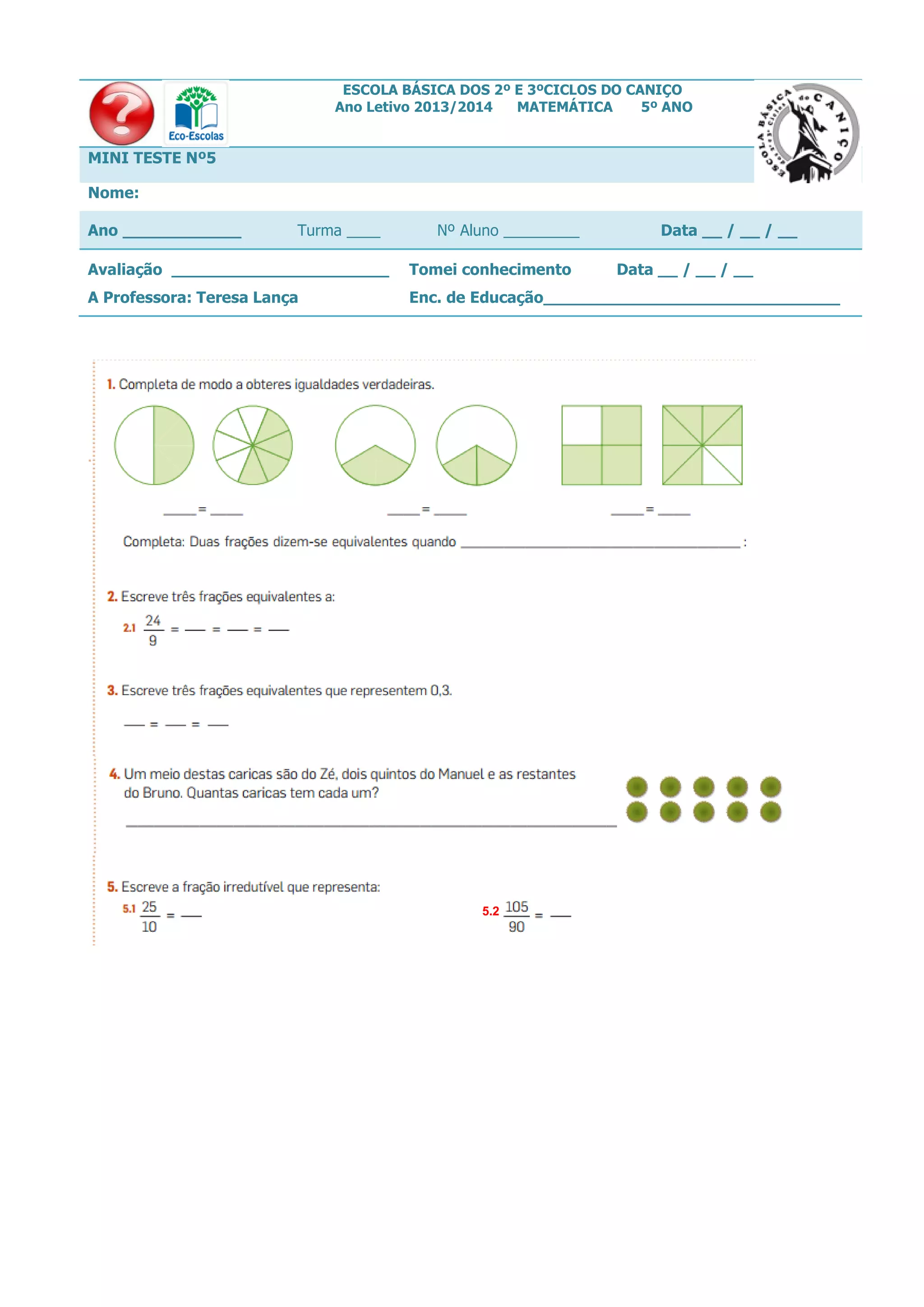 Este documento é um mini teste de matemática do 5o ano para uma escola básica em Portugal. Contém o nome do aluno, ano, turma, número do aluno e data para preenchimento, além da assinatura da professora e espaço para o encarregado de educação assinar após tomar conhecimento das notas.