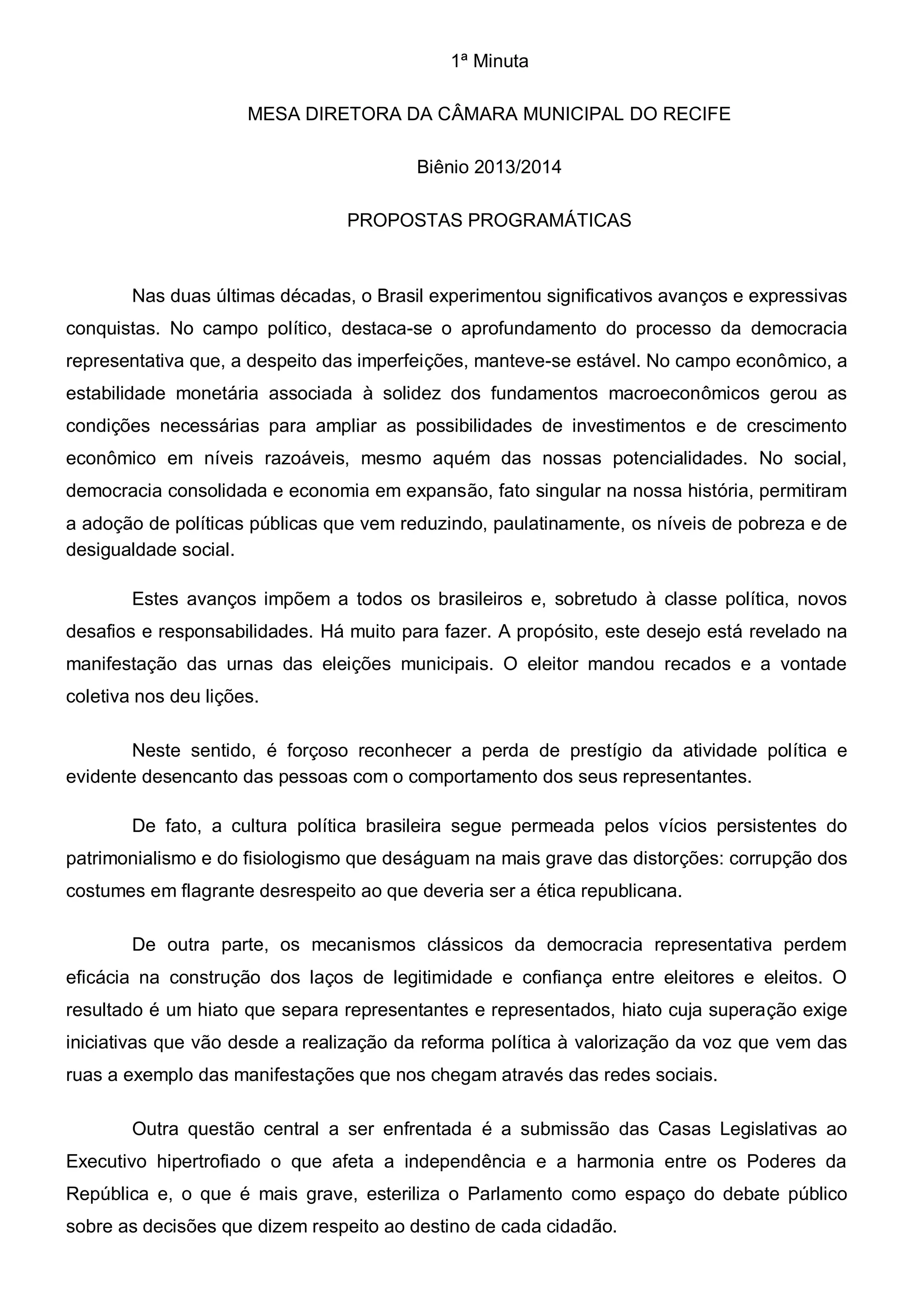 O documento propõe um programa de ações para a Mesa Diretora da Câmara Municipal do Recife para os anos de 2013-2014, visando elevar o debate sobre soluções para problemas da cidade e alinhar a Câmara aos anseios populares. Entre as 12 propostas estão a implantação da Tribuna Popular, criação de uma Corregedoria, digitalização do acervo legal, e trazer debates estratégicos para o futuro da cidade à Câmara.