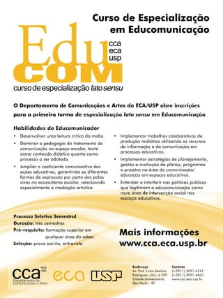 Este documento fornece informações sobre a Revista Comunicação & Educação, publicada pelo Departamento de Comunicações e Artes da Universidade de São Paulo. A revista está em seu 18o ano de publicação e contém artigos que discutem comunicação e educação. Ela é indexada em bancos de dados acadêmicos e tem um conselho editorial internacional.