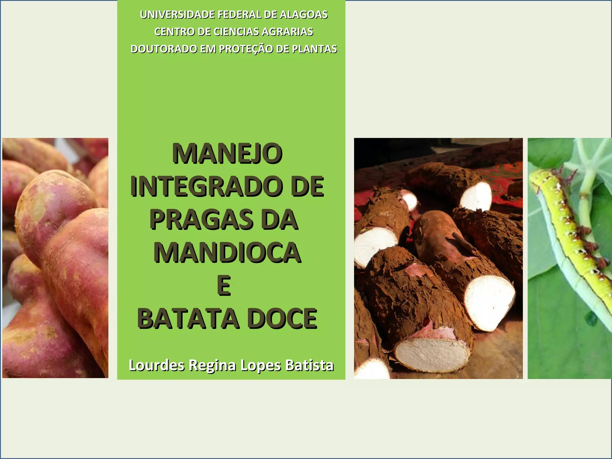 O documento resume as principais pragas da mandioca e batata-doce, incluindo o mandarová, percevejo da renda e ácaro verde na mandioca, e as brocas da raiz e das ramas na batata-doce. Detalha as características, ciclo de vida, danos causados e métodos de controle para cada praga.