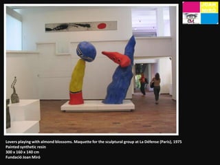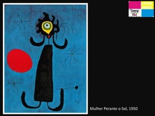 Joan Miró foi um importante pintor e escultor surrealista catalão que explorou o inconsciente e os sonhos em suas obras abstratas utilizando cores vibrantes e símbolos. Ele estudou em Barcelona e Paris, onde conheceu o movimento surrealista, e participou da primeira exposição surrealista em 1925. Ao longo de sua carreira, Miró experimentou diversas técnicas como pintura, cerâmica e escultura.