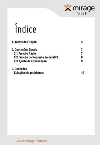 1) O documento fornece instruções sobre como operar um rádio/reprodutor de MP3 chamado Mirage Vibe, descrevendo suas teclas e funções.
