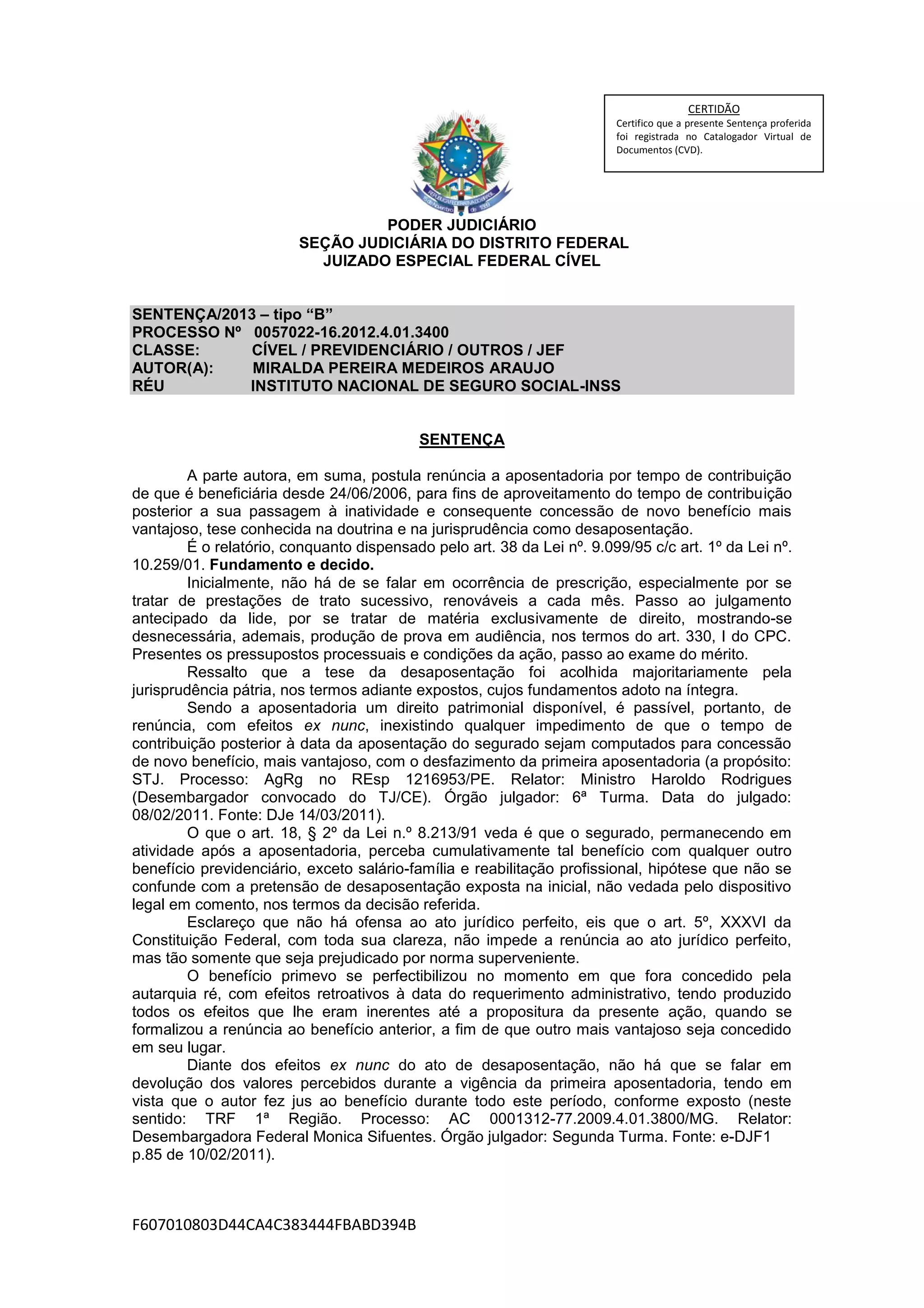 Esta sentença julga procedente o pedido de uma autora para renunciar à sua aposentadoria anterior e receber um novo benefício mais vantajoso, aproveitando o tempo de contribuição posterior à primeira aposentação. A decisão acolhe a tese da "desaposentação" e condena o INSS a implantar o novo benefício.