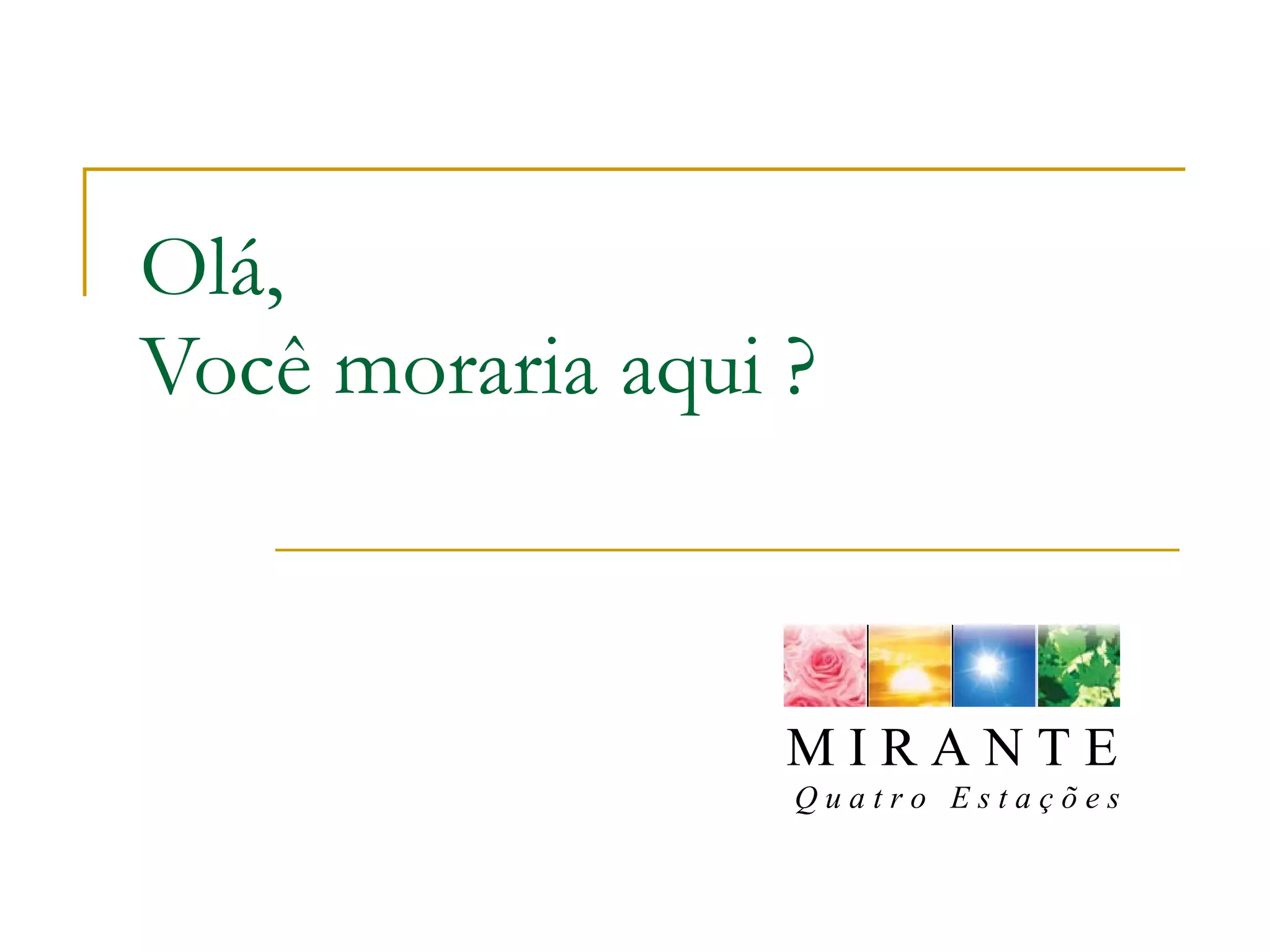 O documento descreve as características e amenities de um condomínio residencial chamado Mirante Quatro Estações, incluindo espaços gourmet, estética, cinema, sacada com churrasqueira, vista panorâmica, minicidade para crianças, piscina adulta e infantil, apartamentos de 3 e 4 dormitórios, e convida o leitor a agendar uma visita para conhecer o empreendimento.