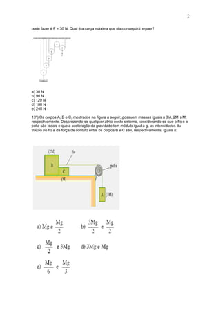 3) As questões envolvem sistemas mecânicos como polias, corpos em movimento sobre planos inclinados e sistemas de corpos ligados por fios.