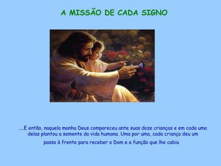Deus concede dons e missões específicas a cada um dos 12 signos do zodíaco. A Aries é dada a missão de plantar a semente da consciência e o dom do respeito próprio. A Touro é dada a missão de transformar a semente em substância e o dom da força. A Gêmeos é dada a missão de levar entendimento por meio de perguntas e o dom do conhecimento.