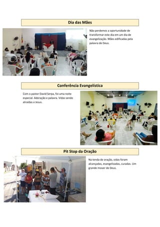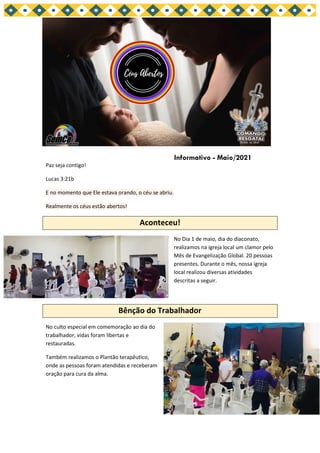 O documento relata as atividades de evangelização realizadas por uma igreja local durante o mês de maio, incluindo cultos especiais, projetos infantis, conferências, treinamentos e ações que resultaram em centenas de pessoas alcançadas e evangelizadas e dezenas de testemunhos de cura e libertação.