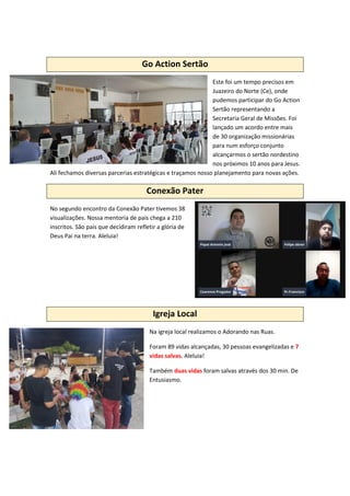 O documento relata o progresso de atividades missionárias, incluindo participação em congressos e parcerias estratégicas para evangelização no sertão nordestino. Destaca eventos de alcance comunitário, como 'adorando nas ruas', e a conclusão da escola de oração do projeto Amai. O autor agradece aos apoiadores e solicita orações por saúde e pela continuidade das iniciativas missionárias.