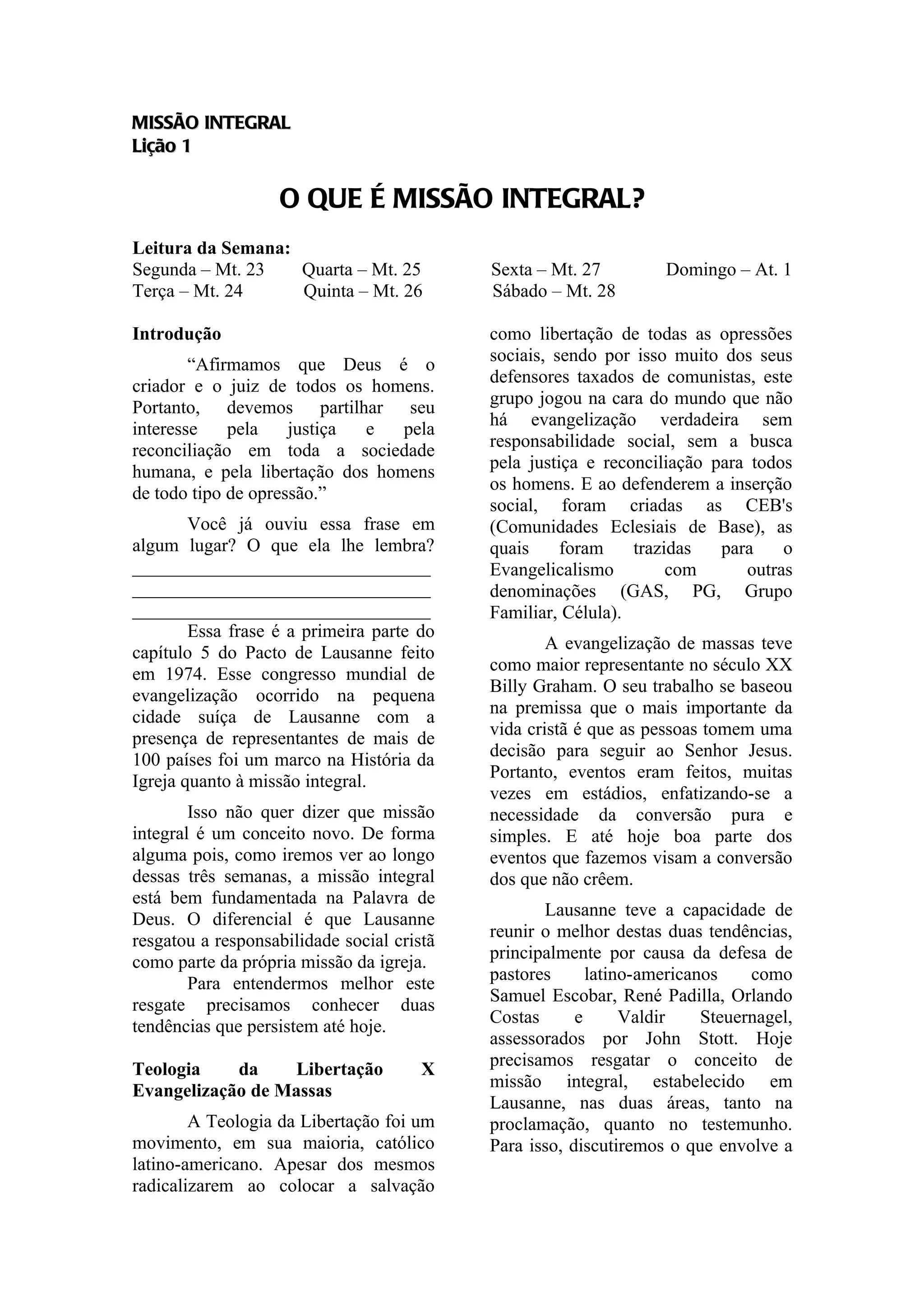 [1] O documento discute o conceito de Missão Integral, que envolve tanto a proclamação do evangelho quanto o testemunho social através de ações. [2] A Missão Integral busca formar discípulos de Jesus que reconheçam Sua autoridade sobre todas as áreas da vida e trabalhem pela justiça. [3] O documento analisa a Teologia da Libertação e a Evangelização de Massas como tendências históricas, e como o Congresso de Lausanne ajudou a reunir essas visões em um conceito abrangente de missão