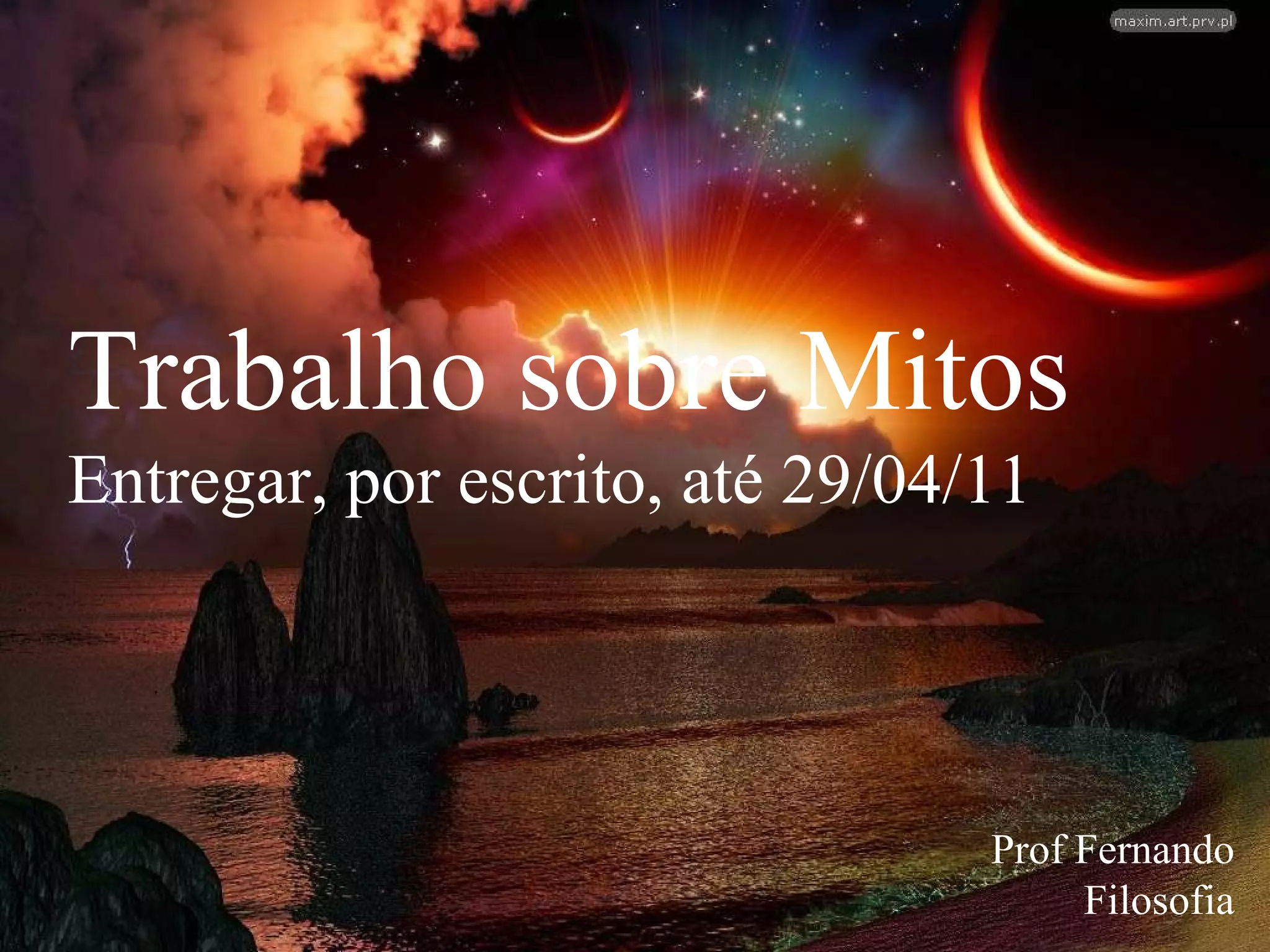 O documento discute o conceito de mito, comparando-o com a filosofia. Define mito como uma narrativa tradicional que busca explicar fenômenos naturais e origens do mundo de forma simbólica e não racional. A filosofia, por outro lado, busca explicações lógicas e coerentes através de discussão e argumentos. O documento também apresenta o mito de Prometeu e pede para responder questões sobre exemplos de elementos míticos na atualidade.