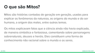 O documento explora a transição da mitologia para a filosofia no ocidente, destacando o papel dos mitos na explicação de fenômenos naturais e na compreensão do mundo pelos antigos gregos. À medida que novas formas de conhecimento surgiram, como a ciência e a política, os mitos foram questionados, levando ao desenvolvimento do pensamento filosófico. A filosofia foi então definida como uma busca pela sabedoria e uma investigação crítica das verdades aceitas, com foco na reflexão sobre a condição humana e suas relações com o mundo.