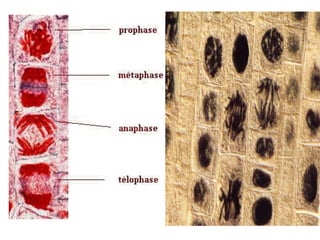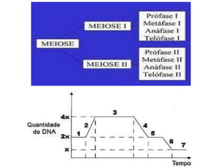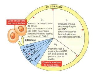 1) O documento descreve as etapas do ciclo celular, mitose e meiose, incluindo a duplicação do DNA, condensação dos cromossomos e divisão das células.
