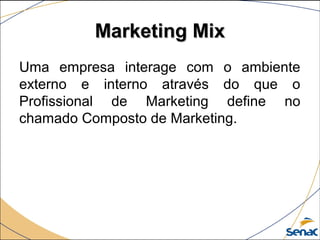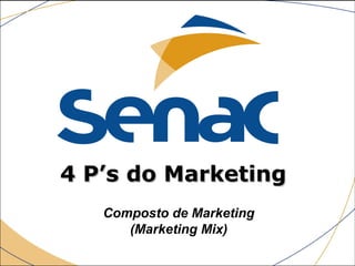 O documento discute os 4 P's do marketing mix, focando no P de Produto. Explica que o Produto é o que uma empresa oferece ao mercado consumidor e classifica os produtos como bens duráveis, não duráveis e serviços. Também discute categorias de produtos, portfólio de linhas, ciclo de vida do produto e marcas.