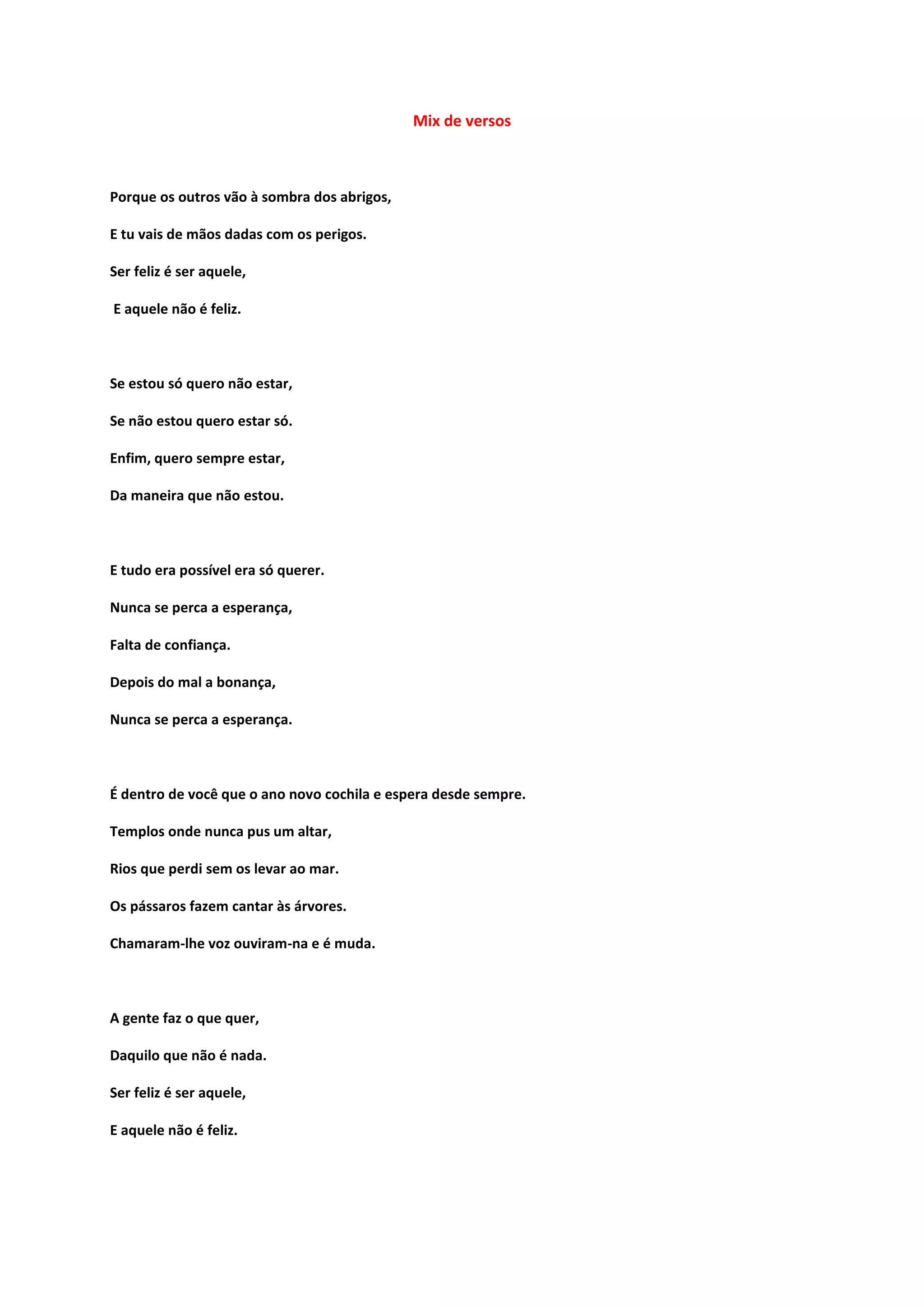 O poema apresenta reflexões sobre felicidade, solidão, esperança e saudade. O autor explora temas como estar sozinho versus estar acompanhado, querer estar de uma maneira mas estar de outra, e como o passado pode parecer mais distante mas a saudade mais próxima.